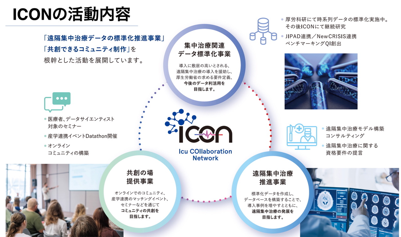 導入に敷居の高いとされる遠隔集中治療の確立をめざします。導入事例を増やすとともに勉強会開催、認定などを通じて厚生労働省の求める要件定義を明確化します。 集中治療領域における時系列標準化データ等を作成し、データベースを構築することで今後のデータ利活用を目指します。 オンラインコミュニティ、産学連携マッチングイベント、セミナーなどを通じて医療関係者やデータサイエンティストなど多職種が共創できるコミュニティの提供を提供します。